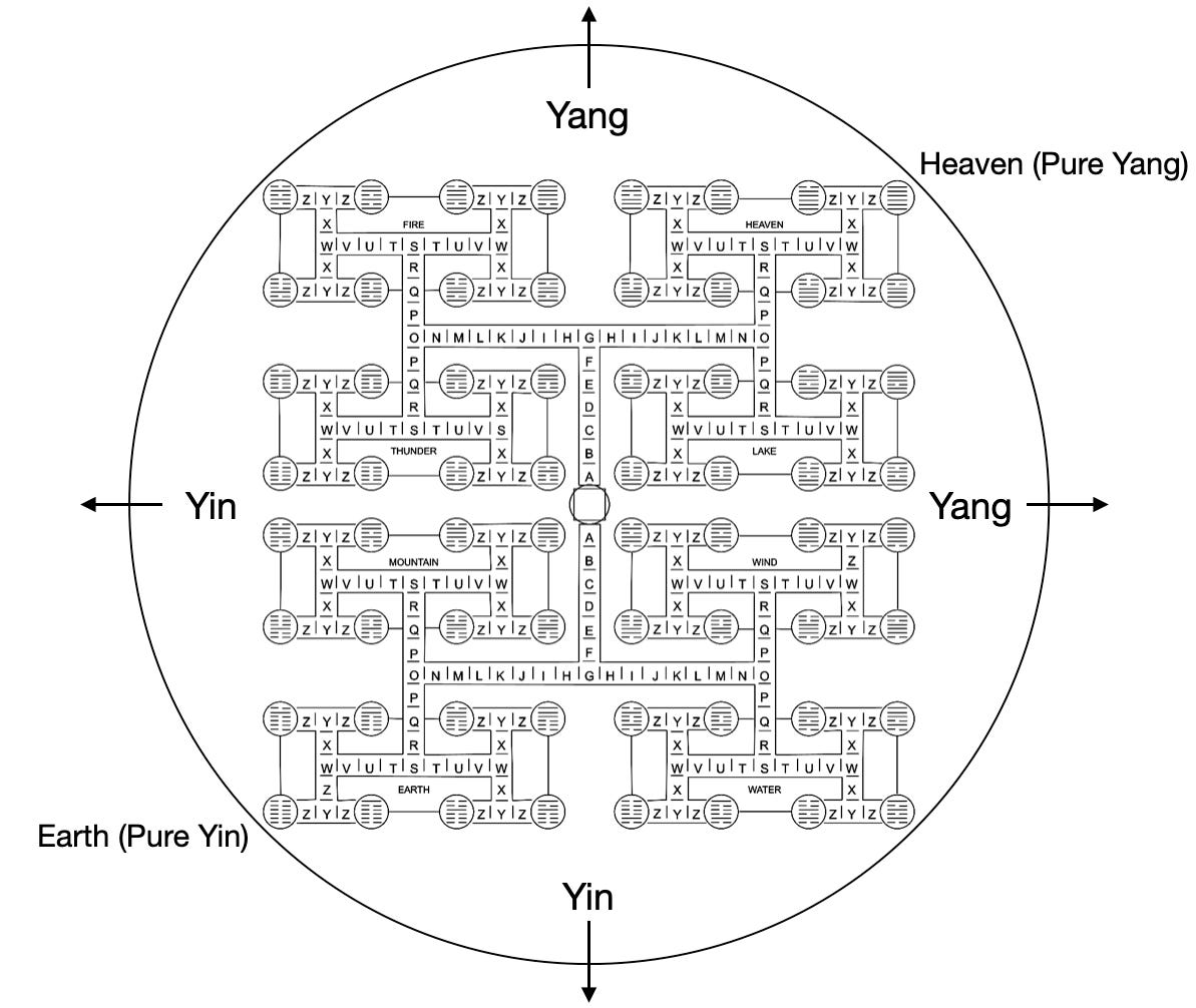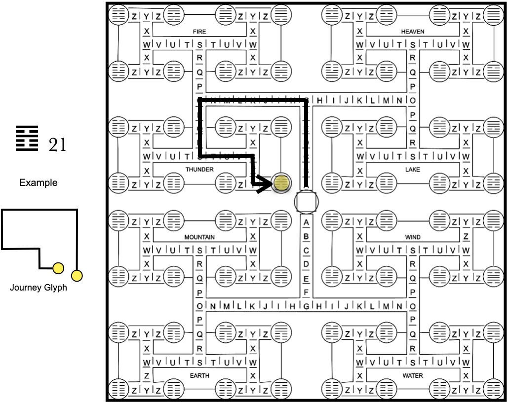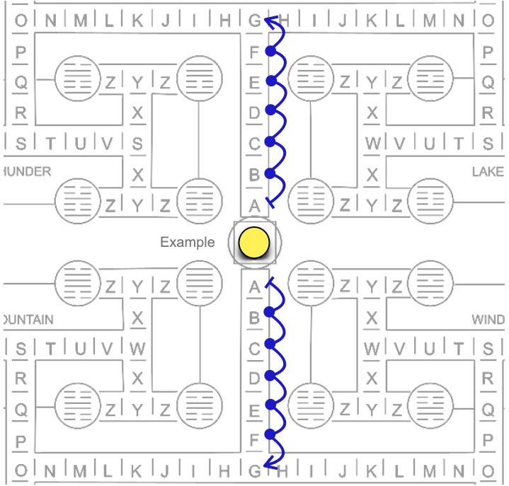 If you trace a line from board position A to any of the 64 endpoints, you will notice the direction one travels determines the hexagram one receives. For instance, if you travel only up (yang) and only right (right), the result would be ䷀ Hexagram 1. Notice there are six yang lines which correlate with completing six yang pathways.