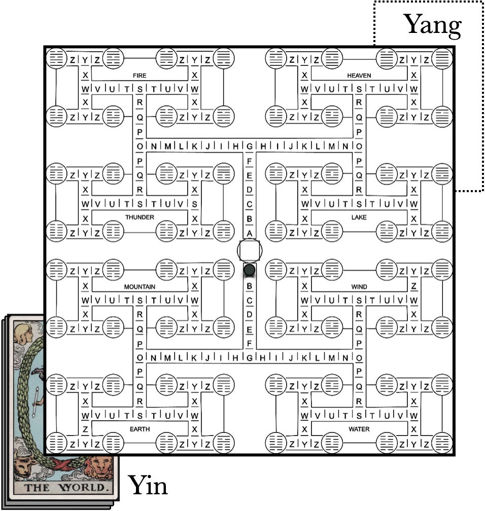 Note: You have now worked with 21 tarot cards. All the cards you have seen should be placed beneath the Hexatetraglyph board. The Yin cards are positioned at the bottom left corner, while the Yang cards are at the top right corner.