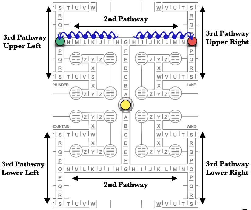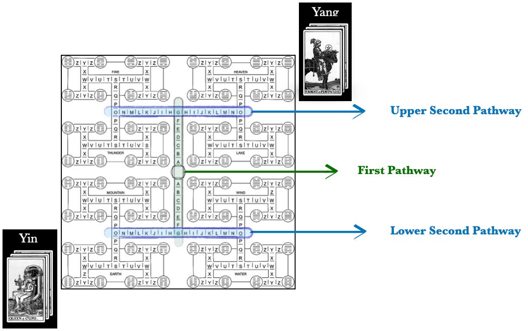 At position Z, the movement pattern you have grown used to becomes slightly The sixth pathway is unique because it only has one position, which is Z. Therefore, if you choose to work with the yin planet on the left, you’ll complete Pathway 6 and reach the hexagram to the left. Conversely, if you choose to work with the yang planet on the right, you’ll complete Pathway 6 at the hexagram to the right. In short, there is no need to count cards at the end of this pathway.